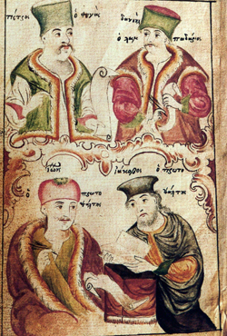 Ученики Школы ориентируются на великих предшественников. На илл. - византийские гимнографы: Петр Византиец, Даниил Ламбадарий, Иоанн Трапезундский, Иаков протопсалт, Рукопись монастыря Великой Лавры на Афоне